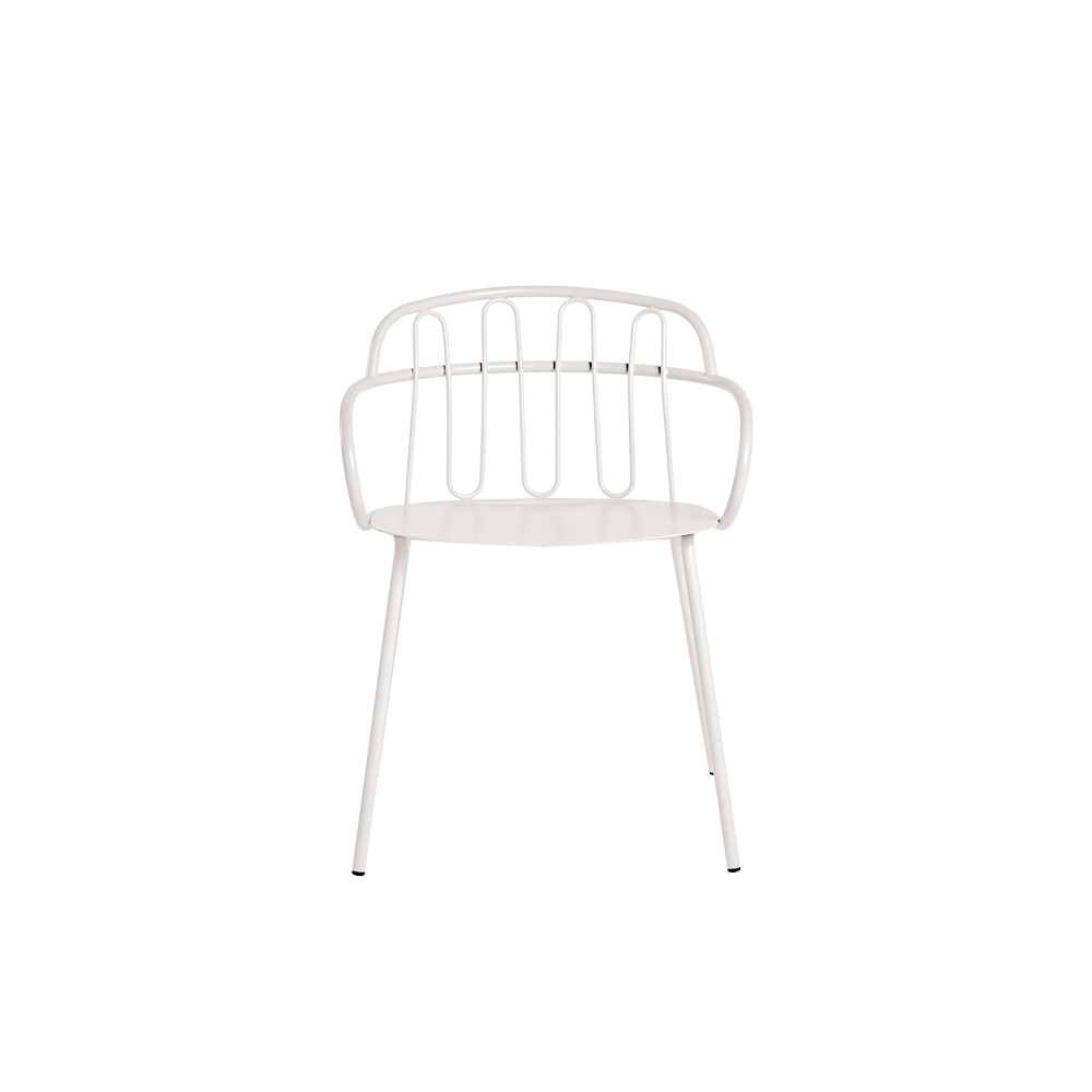 Outdoor armchair. Powder-coated tubular steel frame and back. Seat in sheet steel.